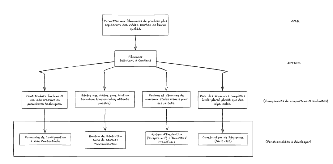 C'est une technique de visualisation qui connecte directement les objectifs business aux fonctionnalités à développer. Elle vous force à répondre à 4 questions structurantes :